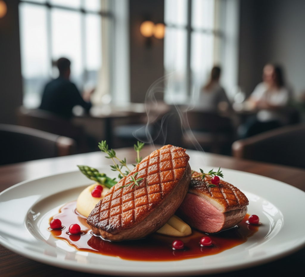 Steak and artistically presented continental dishes
